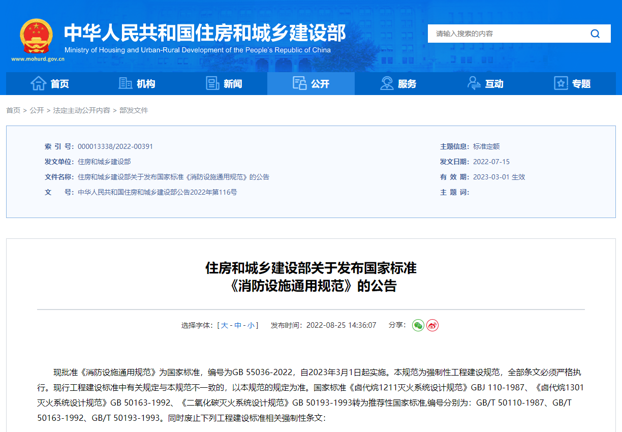 近日,住建部发布一批规范,其中批准《消防设施通用规范》为国家标准,编号为GB 55036-2022,自2023年3月1日起实施。本规范为...