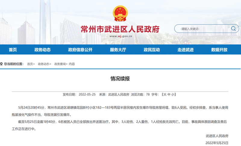 5月24日晚江苏常州一居民楼发生爆炸6人被困现场有房屋倒塌附近商户受损严重。事故造成1死5伤,经初步排查,系当事人使用瓶装液化气操作不当...