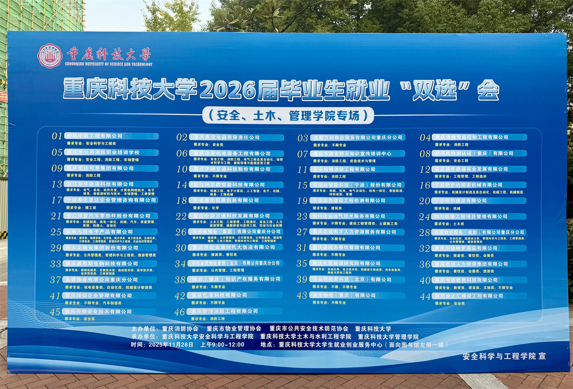 2025年11月26日上午,重庆科技大学大学生就业创业服务中心人头攒动、气氛热烈。由重庆消防协会、重庆市物业管理协会、重庆市公共安全技术防范协会与重庆科技大学联合主办,重庆科技大学安全科学与工程学院、土木与水利工程学院、管理学院共同承办的“重庆科技大学2026届毕业生就业‘双选’会”在这里成功举行。