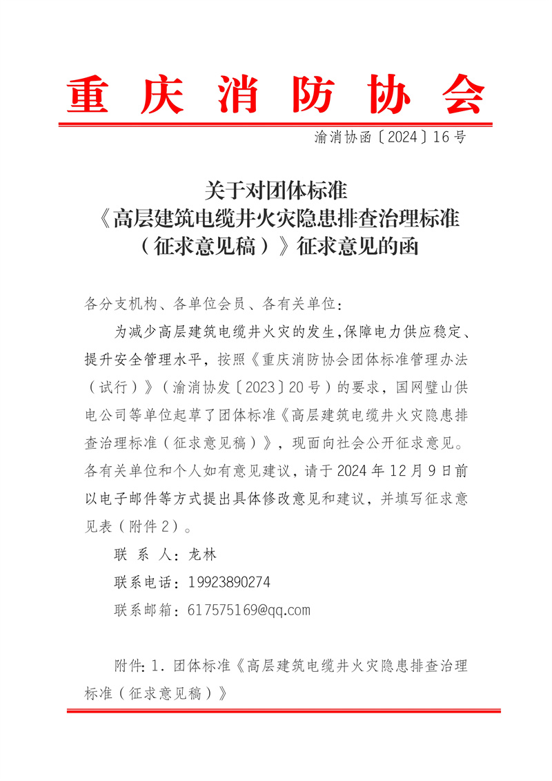 关于对团体标准《高层建筑电缆井火灾隐患排查治理标准(征求意见稿)》征求意见的函