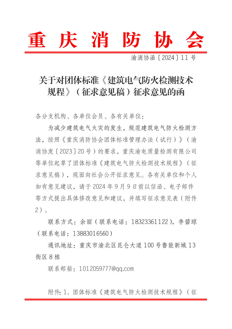 关于对团体标准《建筑电气防火检测技术规程》(征求意见稿)征求意见的函