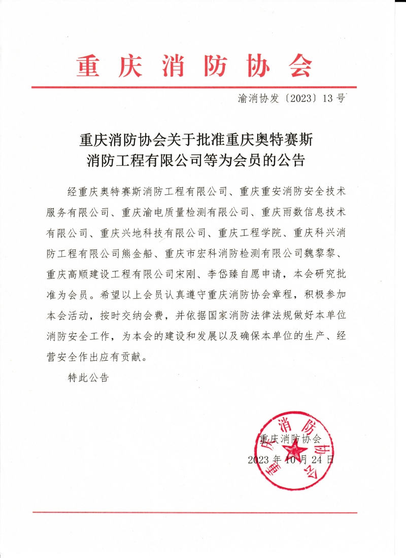 重庆消防协会关于批准重庆奥特赛斯消防工程有限公司等为会员的公告