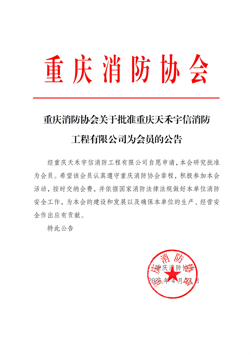 关于批准重庆天禾宇信消防工程有限公司为会员的公告