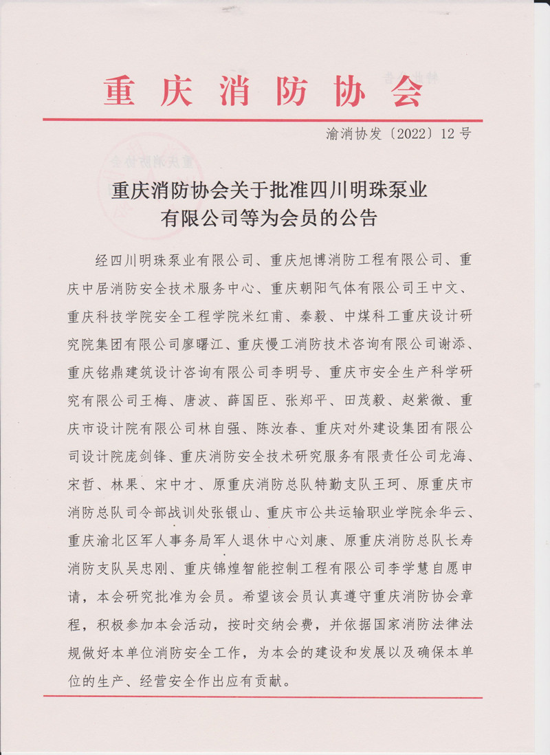 重庆消防协会关于批准四川明珠泵业有限公司等为会员的公告