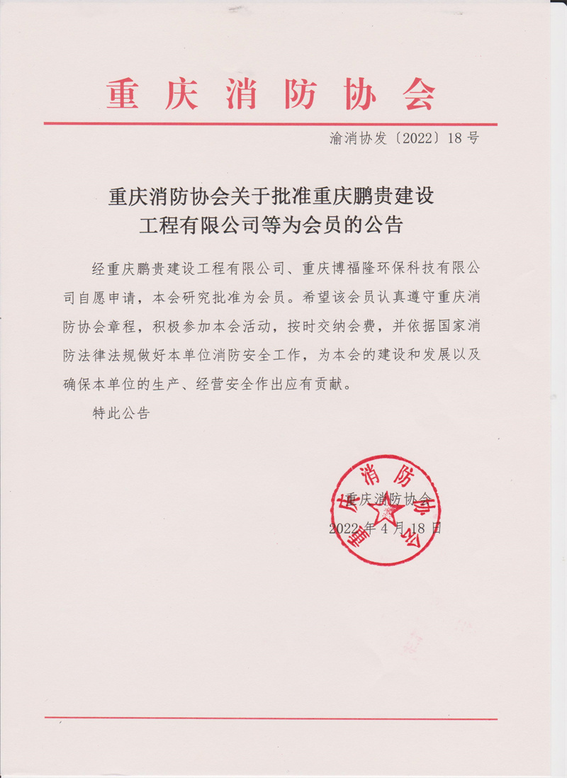 重庆消防协会关于批准重庆鹏贵建设工程有限公司等为会员的公告