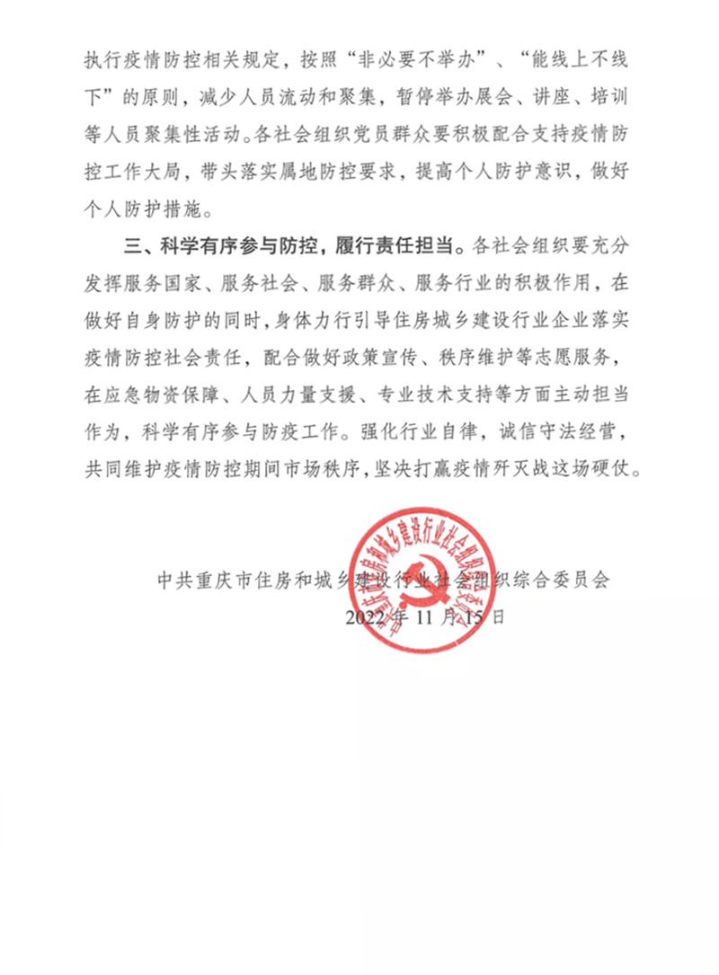 中共重庆市住房和城乡建设行业社会组织综合委员会发布了关于新冠疫情的倡议书,请大家认真学习,遵守疫情防控规定,做好疫情防控工作。