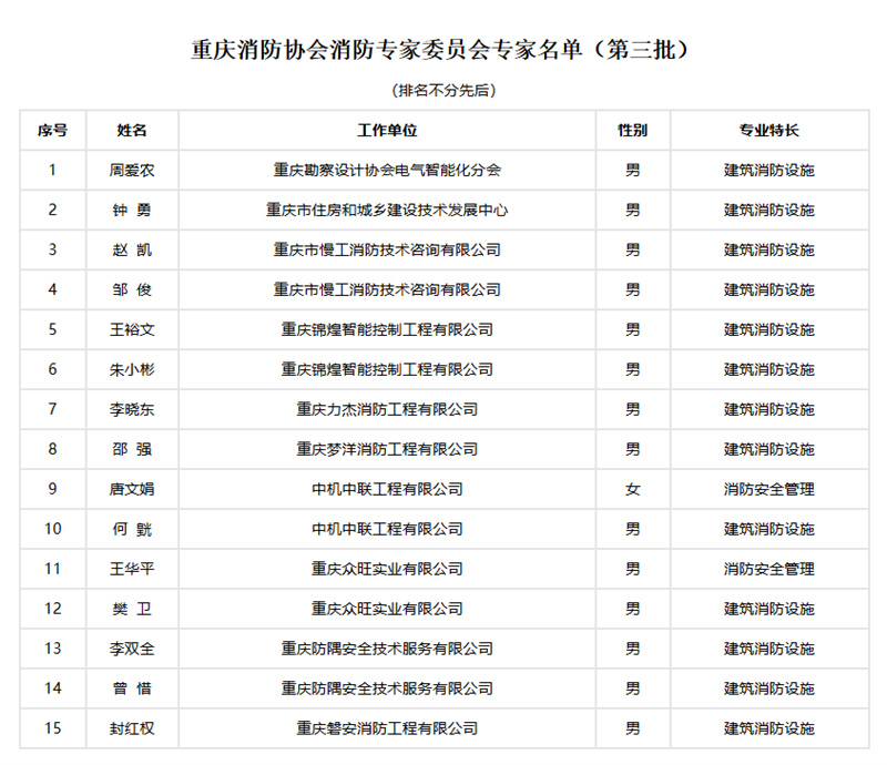根据《关于征集消防专家人才的通知》及《重庆消防协会专家委员会管理办法》文件要求,经个人申请、单位推荐,我会组织审核,拟定了专家委员会第三批专家名单,现予公示,公示期为5个工作日。