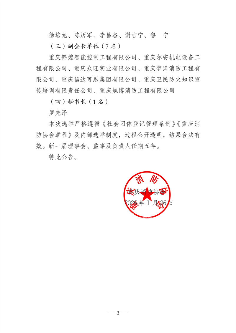 附件:关于重庆消防协会第五届理事会、监事及负责人选举结果的公告(PDF盖章版)