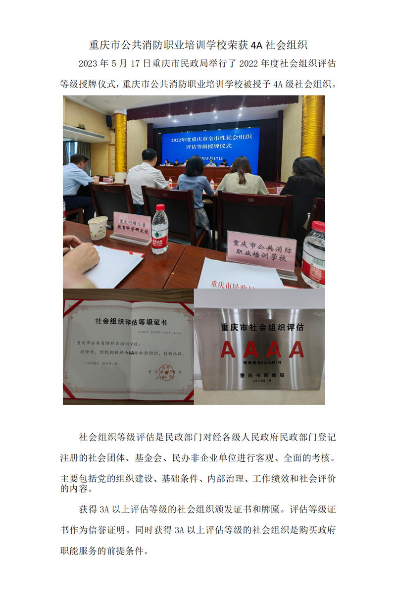 重庆市公共消防职业培训学校荣获4A社会组织