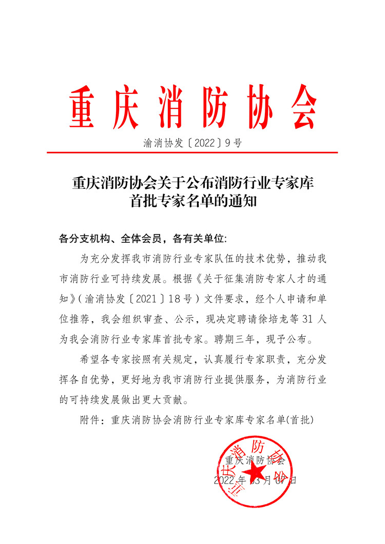为充分发挥我市消防行业专家队伍的技术优势,推动我市消防行业可持续发展。根据《关于征集消防专家人才的通知》(渝消协发〔2021〕18号)文件要求,经个人申请和单位推荐,我会组织审查、公示,现决定聘请徐培龙等31人为我会消防行业专家库首批专家。聘期三年,现予公布。